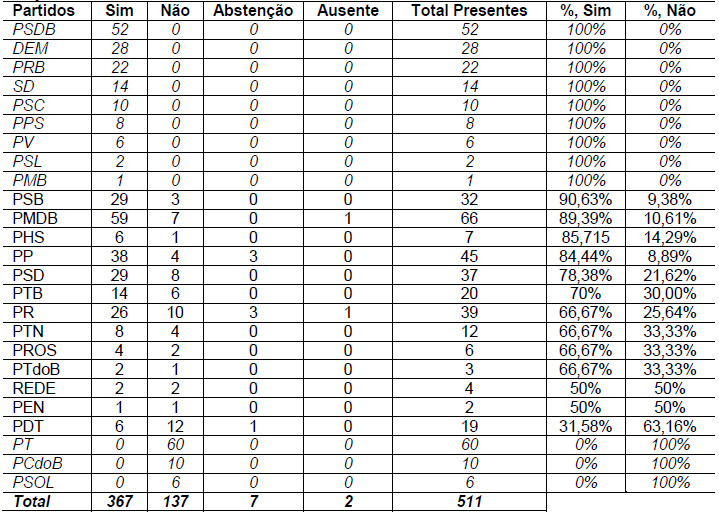 Na Tabela 1 apresenta-se a distribuição de votos em relação a cada partido. Pela natureza delicada da matéria, destaca-se que existem textos de 511 dos 513 parlamentares em exercício na época, o que traz para o corpus uma variedade importante de posicionamentos. Estão destacados os 12 partidos cujos deputados votaram todos da mesma maneira. Destaca-se, além da homogeneidade da votação, que estes partidos representam juntos aproximadamente 43% do total de votos.