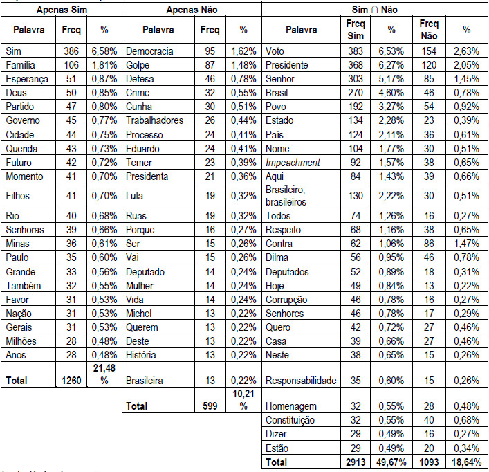 A seguir, apresenta-se a Tabela 2, que apresenta os 50 termos mais frequentes nos discursos entre os deputados que votaram a favor e contra e os 50 termos mais frequentes que são específicos do voto a favor ou contra. Apesar de os discursos que votaram a favor serem mais numeroso dos que os que votaram contra (367 e 144, respectivamente), a média de palavras por voto não foi muito distinta (52,29 para votos “sim” e 58,31 para votos “não”), o que demonstra que ambos grupos utilizaram uma quantidade de termos muito próxima para expor seus argumentos.