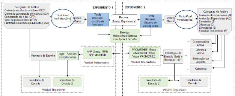 Como variável independente, tem-se o modelo de decisão proposto por um dos dois SADs (AHP MAKH-ER e Visual PROMETHEE), desenvolvidos a partir dos Métodos Multicritérios de Apoio à Decisão (MMAD) PROMETHEE e AHP. No que se refere à tomada de decisão sem um modelo propriamente dito, na qual o sujeito desempenhou a tarefa livremente, esta foi realizada com base no protocolo verbal Think Aloud.
