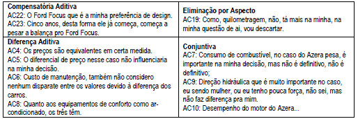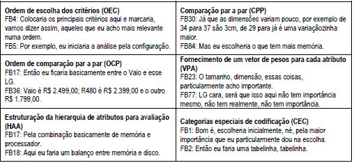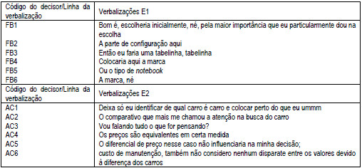 Cabe ressaltar a necessidade do uso de protocolos preestabelecidos. De acordo com Ericsson e Simon (1993), há várias razões para preceder à análise de protocolos com uma descrição explícita de codificações possíveis. Primeiro esse procedimento facilita a avaliação de confiabilidade da codificação, equalizando diferenças de codificadores que codificam a mesma informação de cada protocolo. Em segundo lugar, uma grande quantidade de informações contextuais sobre a tarefa pode ser incorporada nas categorias de codificação, cabendo ao codificador apenas fazer uma escolha entre as categorias bem definidas, não precisando identificar novamente as estruturas que estão sendo usadas (Ericsson & Simon, 1993). Ainda, segundo Neves (2004), a escolha ou pressuposição de categorias a serem observadas em um estudo deve ser feita, considerando o objetivo da investigação. Neste sentido, as Figura 3 e 4 apresentam evidências do processo decisório e uso de múltiplas estratégias de decisão, respectivamente, a partir de extratos dos protocolos verbais obtidos nos E1 e E2.