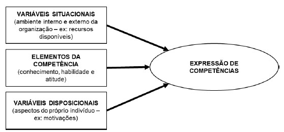 Abbad, Freitas e Pilati (2006) sugeriram um modelo de investigação segundo o qual o desempenho competente (expressão de competências) é função de três tipos de condições no trabalho: (1) os ambientais (materiais, físicas e psicossociais), que dizem respeito ao “poder fazer”; (2) os saberes individuais (conhecimentos, habilidades e atitudes) relacionados ao “saber fazer”; e (3) as motivações (razões, metas, aspirações), ligadas ao “querer fazer”. Estas condições podem ser associadas à teoria da atribuição da causa de Heider (1958), a qual estabelece que os comportamentos para gerar o desempenho são decorrentes de causas interna ou disposicionais, ou seja, é a vontade do próprio indivíduo em relação a alguma coisa; e de causas externas ou situacionais, ou seja, vinculadas ao ambiente em que o indivíduo está inserido.
