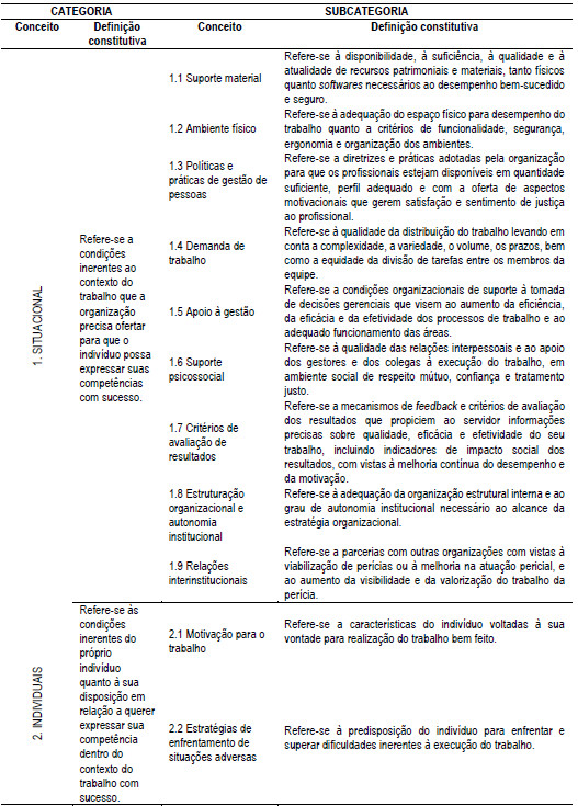 A partir da análise dos dados coletados, foi possível definir duas categorias de aspectos que influenciam a expressão de competências, resultado que se alinha à literatura especializada (Heider, 1958; Brandão & Borges-Andrade, 2007) quanto à necessidade de oferta de condições de suporte organizacional (situacionais) e em relação ao próprio indivíduo (individuais), a partir da análise dos relatos apresentados pelos participantes na pesquisa. No entanto, identificou-se a necessidade de estabelecer subcategorias relacionadas a cada uma delas, para dar maior riqueza e clareza dos dados obtidos, sendo definidas nove subcategorias dos aspectos situacionais e duas de disposicionais. A Tabela 1 apresenta os nomes e as definições constitutivas dos aspectos que influenciam a expressão de competências.