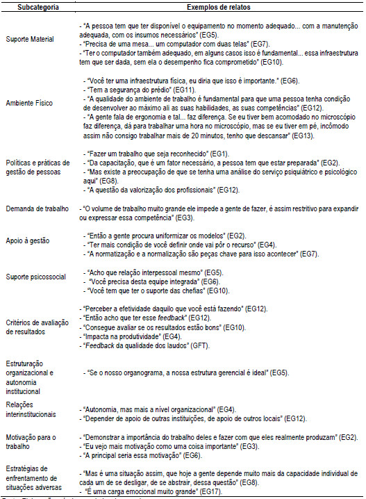 A Tabela 2 exemplifica os relatos que subsidiaram a subcategorização, incluindo a identificação do sujeito com uso do código “GFT” para grupo focal com técnicos e “EG” para entrevista com gestor e numeração aleatória ao gestor. Ressalva-se que algumas exemplificações foram limitadas, devido ao fato de que a inserção dos relatos poderia comprometer o sigilo da identificação da organização, por isso não foram incluídos.