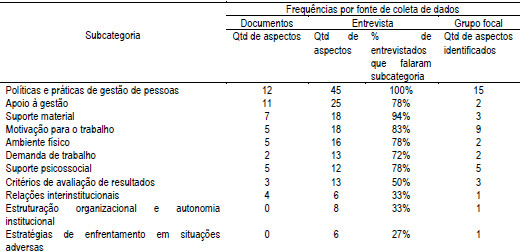 Ainda que não fosse o objetivo inicial do estudo, os resultados obtidos com uso de diferentes técnicas indicam a pertinência desta escolha metodológica, pois permitiu a triangulação das informações, tanto como forma de confirmação das diferentes perspectivas como complemento de dados necessários ao resultado obtido. A pesquisa documental por si só não produziria informações suficientes para a definição dos aspectos, uma vez que não foi possível identificar dados relacionados a duas subcategorias (Estruturação organizacional e autonomia institucional da categoria situacional e Estratégias de enfrentamento em situações adversas da categoria individual). Mesmo assim, o uso desta técnica agregou valor no sentido de permitir conhecer o contexto da organização, bem como identificar temas que não haviam sido observados nas outras duas técnicas de coleta em relação às quatro subcategorias (Motivação, Relações institucionais, Suporte psicossocial e Apoio à gestão).