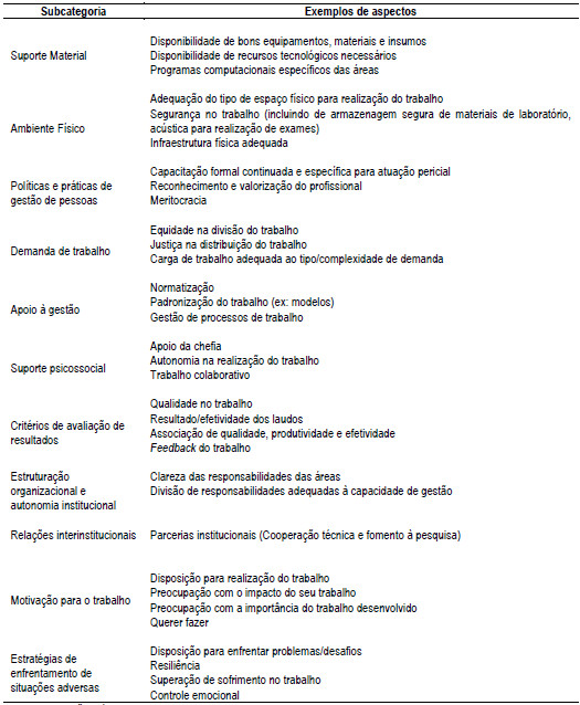 Abstract: This article aims to identify aspects that influence the expression of competencies of professionals in the area of forensic science in a Brazilian public organization. This transversal, descriptive-exploratory study used qualitative methods, through research on organizational documents related to the theme that were necessary to understand the organizational context, interviews with nineteen managers who work in the forensic area, and a focus group with experts in the area of criminal forensics. Two categories of aspects (situational and individual) were identified, and these were further subdivided into eleven subcategories: Situational (material support, physical environment, policies and practices of people management, work demand, management support, psychosocial support, criteria for evaluation of the results, organizational structure and institutional autonomy) and individual (motivation for work and strategies for confronting adverse situations). The research participants evaluated support material and the physical environment more favorably, while also considering motivation as an important predictive variable to express the competencies of the job. The results showed that there are aspects of perception of organizational support similar to those found in the literature in other work contexts, and specific factors were found that were not observed in previous studies and not measured in the context of forensics activity.