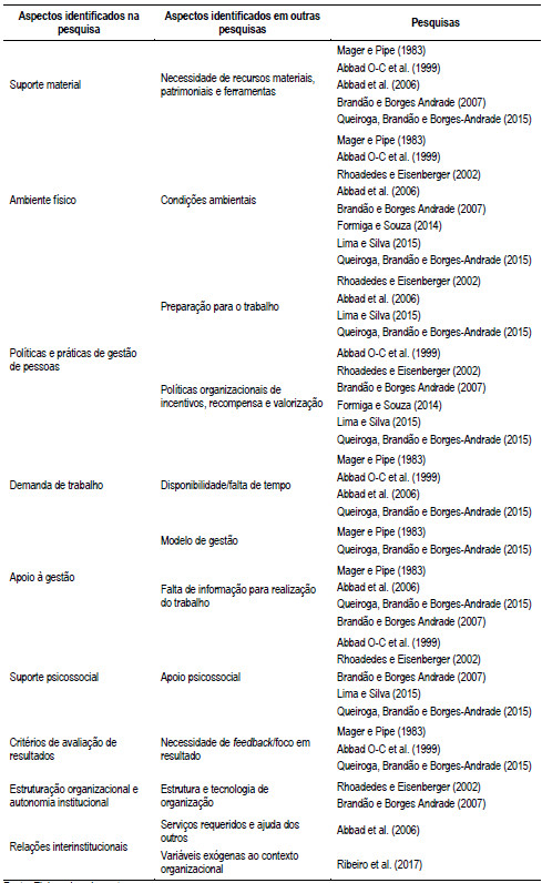 O estudo confirmou a importância de suporte organizacional e de aspectos situacionais como antecedentes da expressão de competências, tanto das condições ofertadas pela própria organização, que foram denominados de situacionais (MAGER; PIPE, 1983; ABBAD O-C et al., 1999; ABBAD et al., 2006; BRANDÃO; BORGES-ANDRADE, 2007; FORMIGA; SOUZA, 2014; QUEIROGA; BRANDÃO; BORGES-ANDRADE, 2015), quanto aos que são inerentes do próprio indivíduo em querer fazer algo (ABBAD et al., 2006; BRANDÃO; BORGES-ANDRADE, 2007; LIMA; SILVA, 2015). Pode-se verificar alinhamento entre os achados e a literatura quanto aos aspectos situacionais, conforme indicado na Tabela 5.