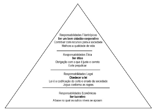 No final da década de 1979, Ashley Carrol propôs um dos modelos mais desatacados de RSC, descrevendo a responsabilidade das organizações com as perspectivas de responsabilidades econômicas, legais, éticas e voluntárias inerentes ao funcionamento e ao exercício de suas finalidades. Carrol (1991) aprimora o modelo incorporando o enfoque das partes interessadas, no qual as responsabilidades empresariais podem ser representadas em modelo no formato de pirâmide. A Figura 1 apresenta a pirâmide de Carrol (1991) para RSC. Os níveis da pirâmide foram nomeados segundo as perspectivas econômica, legal, ética e filantrópica.