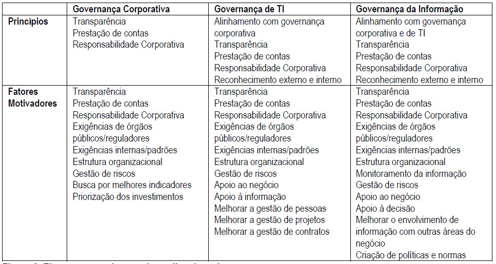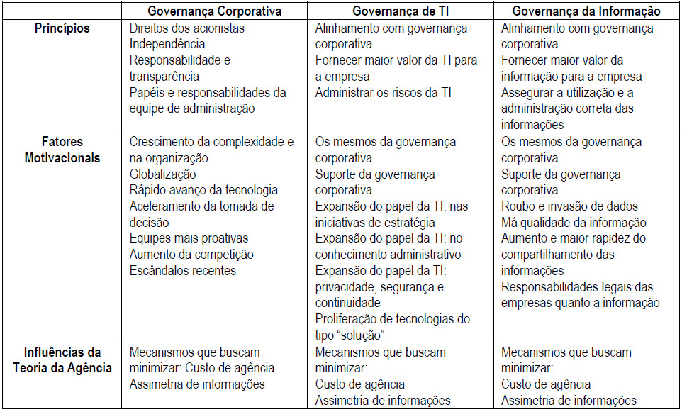 Governança pode ser um termo já comum hoje (Kooper, Maes & Lindgreen, 2011), mas depois da introdução dessa estrutura, são necessários mais detalhes sobre as diferenças entre governança corporativa, de TI e da informação. Para auxiliar na diferenciação entre os tipos de governança, ver Quadro 1, adaptado de Hamaker (2003).