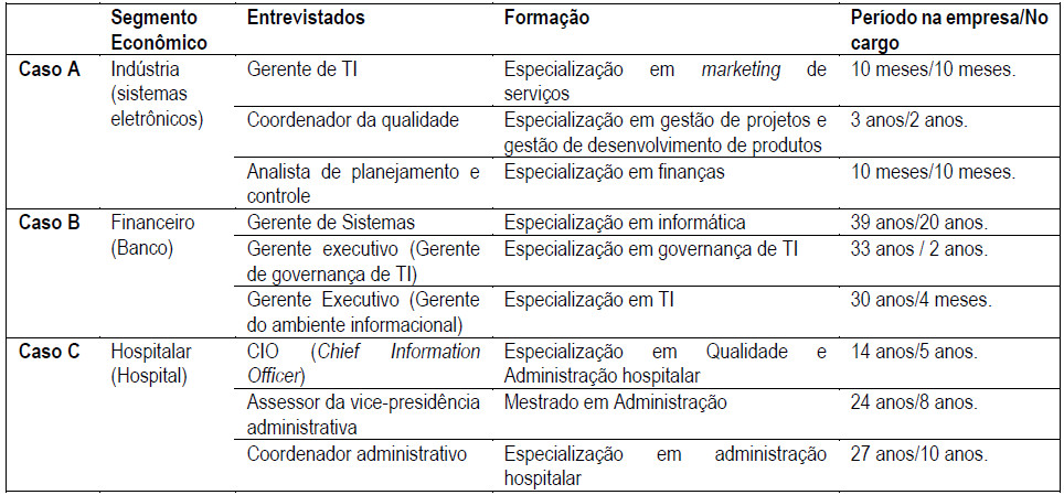 Para a seleção dos entrevistados, utilizou-se a técnica snowball ou bola de neve. Essa técnica é utilizada em pesquisas qualitativas e é indicada para quando a seleção randômica é de difícil realização (Biernacki & Waldford, 1981), como é o caso dessa pesquisa. Assim, a técnica de bola de neve proporciona a seleção adequada dos entrevistados, dado que o primeiro entrevistado, que conhece a organização em que trabalha, poderá indicar pessoas que agreguem informações relevantes à pesquisa (Patton, 2002). Nessa pesquisa se estipulou o mínimo de três entrevistas em cada caso e a definição do máximo de entrevistados foi a saturação das informações. Ou seja, quando as informações advindas das entrevistas se tornaram redundantes. Assim, no Quadro 2 pode se ter um resumo dos entrevistados de cada caso.