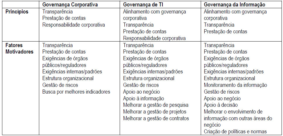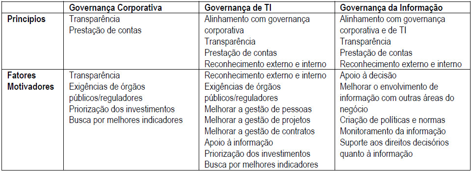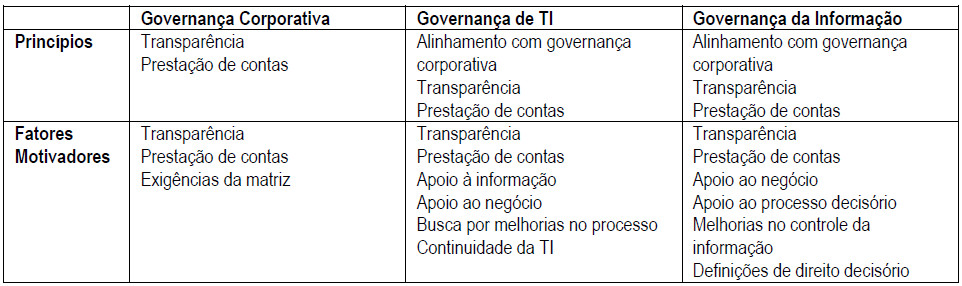 É crescente o número de organizações que adotam de forma mandatória, ou não, a Governança Corporativa, de TI e, mais recentemente, a Governança da Informação (Bala, 2018). Assim, essa pesquisa objetiva analisar os princípios e os fatores motivadores que auxiliam as organizações no processo de adoção destes três tipos de governança.