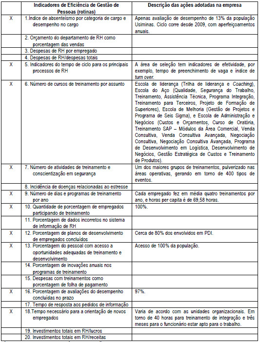 Assim como na temática II, os profissionais entrevistados foram convidados a assinalar, na primeira coluna, dentre os 20 itens que compõem os “Indicadores de Eficiência de Gestão de Pessoas (rotinas)” (descritos na segunda coluna), quais os que fazem parte das atividades gerenciadas pela área de Desenvolvimento e Gestão de Pessoas do Grupo Usiminas. E, na terceira coluna, as respondentes descreveram, para cada item assinalado, as ações que evidenciam a efetivação, por parte da organização, dos respectivos indicadores. Conforme identificado na temática II, mais uma vez o Grupo Usiminas desponta com uma presença de atividade e rotinas – destacadamente vinculadas aos aspectos gerais e de ações de desenvolvimento em 50% dos itens propostos. O item de maior relevância foi o número 6, o qual aponta quatro grandes ações voltadas ao desenvolvimento profissional dos colaboradores: a Escola de Liderança, composta pelos programas Trilha de Liderança e Coaching; a Escola do Aço, com os cursos técnicos, de qualidade, segurança no trabalho, treinamento para assistência técnica, programa de integração, treinamento para terceiros e projeto formação de supervisores; as Escolas de Melhoria; e a Escola de administração de negócios, cada qual com seus programas especificamente delineados.