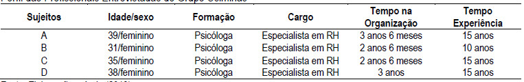 Conforme as informações apresentadas na Tabela 1, constata-se que todos os entrevistados pertencentes ao gênero feminino possuem formação em Psicologia, ocupam o cargo de Especialista em Recursos Humanos e apresentam idade média de 36 anos. Destaca-se, ainda, que o tempo médio que estão na organização é de três anos, e o tempo médio de experiência na área de RH é de 14 anos. Observa-se a presença de profissionais com formação na área das Ciências Humanas, em alinhamento ao departamento de Recursos Humanos, com maturidade pessoal e profissional, o que demonstra a compreensão do cenário organizacional em que atuam. Ressalta-se que todos os entrevistados foram nomeados como sujeitos para a preservação de suas identidades.