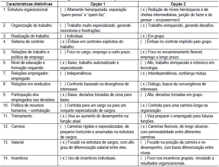 A Tabela 2 demonstra as questões relacionadas à temática I, a qual possui três colunas. Na primeira coluna, há as 14 “características distintivas” delineadas por Albuquerque (2002); na segunda e na terceira colunas, sob o formato de “opção 1” e “opção 2”, respectivamente, estão descritos os itens que compõem cada uma das características. Os entrevistados foram convidados a assinalar uma das opções de acordo com a situação que melhor descrevesse como ocorrem as respectivas situações no Grupo Usiminas.