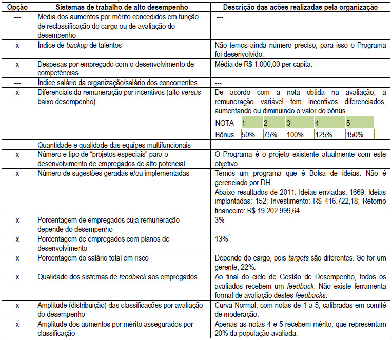 Para o presente estudo, os entrevistados foram convidados a assinalar, dentre os 14 itens que compõem os “Sistemas de Trabalho de Alto Desempenho”, delineados por Becker, Huselid e Ulrich (2001), quais os que fazem parte das atividades gerenciadas pela área de Desenvolvimento e Gestão de Pessoas do Grupo Usiminas. Na terceira coluna, os profissionais descreveram, para cada item assinalado, as ações que evidenciam a efetivação, por parte da organização, do respectivo “Sistemas de Trabalho de Alto Desempenho”.