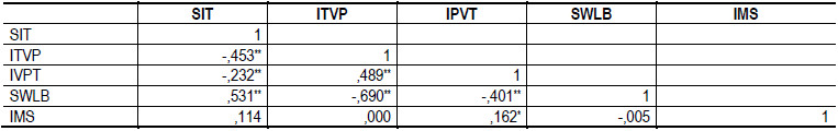 Correlações entre as dimensões: Suporte da Instituição de Trabalho [SIT]; Interferência do Trabalho na Vida Pessoal [ITVP]; Interferência da vida pessoal no trabalho [IPVT]; Satisfação com o equilíbrio entre vida e trabalho [SWLB]; Influência das Mídias Sociais [IMS] foram computados e apresentados no Figura 1.