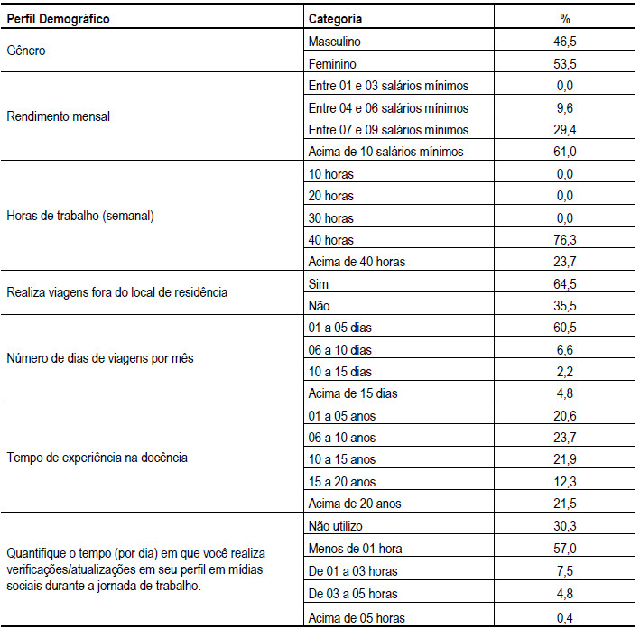 A Tabela 1 destaca que 53,5% são do sexo feminino e 46,50% masculino. Dos participantes da pesquisa, 55,70% possuem mais de dez anos de experiência na docência, e 90,40% possuem rendimento mensal superior a sete salários mínimos, laborando 40 horas semanais ou mais.