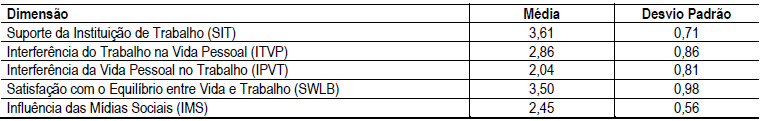 Na Tabela 2, pode-se observar que os valores médios das dimensões variam de 2,45 a 3,61. O maior resultado médio de 3,61 é o do “Suporte da Instituição de Trabalho”, enquanto o mais baixo escore médio de 2,04 é o de “Interferência da Vida Pessoal no Trabalho”.
