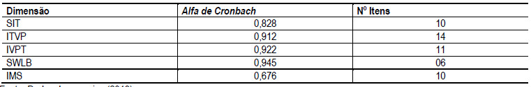 A confiabilidade das dimensões foi avaliada usando o teste Alfa de Cronbach (Tabela 3). Segundo Hair Jr. et al. (2009), este indicador faz a mensuração da confiabilidade em uma variância de 0 a 1, sendo os valores de 0,60 a 0,70 considerados o limite inferior de aceitabilidade. Nesta pesquisa, os valores foram considerados de boa confiabilidade dos dados.