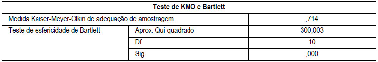 Por meio do teste KMO [Kaiser-Meyer-Olkin – Measure of Sampling Adequacy], que determina a adequação amostral no que concerne o grau de correlação parcial, variando de 0 a 1, percebe-se que KMO próximo a 1 indica que é muito adequada a utilização da técnica de Análise Fatorial [AF]. Em contrapartida, valores próximos a 0 refletem correlação fraca entre as dimensões. Destaca-se que, para a correta utilização da AF o KMO, deve ser no mínimo de 0,6 (Fávero et al., 2009; Hair Jr. et al., 2009). Diante disso, o teste KMO denotou razoável poder de explicação (0,714), conforme destacado na Tabela 4. Por sua vez, o teste de esfericidade Barlett’s apresentou p-value de 0,000, indicando que há correlação entre as dimensões, dessa forma é aconselhável a utilização da AF (Tabela 4). Evidencia-se que para o p-value ser significativo, ele deve ser abaixo de 0,05 (Fávero et al., 2009; Hair Jr. et al., 2009). Todos os 54 componentes conjuntos neste estudo contribuíram para 70,84% da variância total.