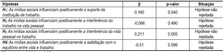 De acordo com a Tabela 5, as mídias sociais influenciam positivamente a interferência da vida pessoal no trabalho. Sobre a influência positiva das mídias sociais, König e Caner De La Guardia (2014) apresentam em sua pesquisa resultados diferenciados deste estudo, demonstrando que as mídias sociais possuem influência negativa da vida pessoal no trabalho.