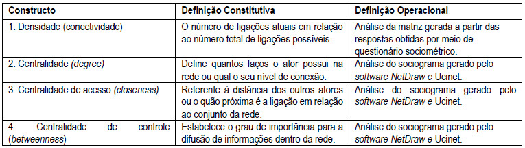 Considera-se rede a interligação das organizações, vistas como atores ou agentes, um ponto ou nó na formação de elos (Nohria, 1992). A análise da estrutura e da formação de redes representa as relações estabelecidas entre os atores pertencentes, bem como as formas de conectividade entre os diferentes atores que buscam, por meio desses relacionamentos, a excelência em seus processos (Balestrin, Vershoore, & Reyes Jr. 2010). Logo, nota-se que o objetivo principal da análise da estrutura de rede consiste em compreender como e quanto os diferentes agentes se relacionam, de que forma e com que intuito.