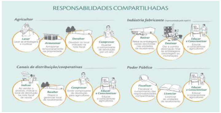 De acordo com Balestrin e Verschoore (2008), o fluxo desse processo, no sentido de rede de cooperação, compreende uma sequência de agentes interconectados, que buscam a solução para o problema do descarte e do retorno das embalagens. O governo federal e o ministério da agricultura regulamentam e fiscalizam a aquisição e o retorno dessas embalagens. A indústria produtora atua no financiamento desse processo. Os distribuidores ou os fornecedores atuam como vendedores e, também, como postos de coleta desses materiais após sua utilização. O produtor ou consumidor faz uso e entrega do material, além das associações que trabalham diretamente na conscientização, na coleta, na triagem e no direcionamento de todo material (Demajorovic & Massote, 2017).