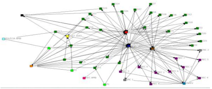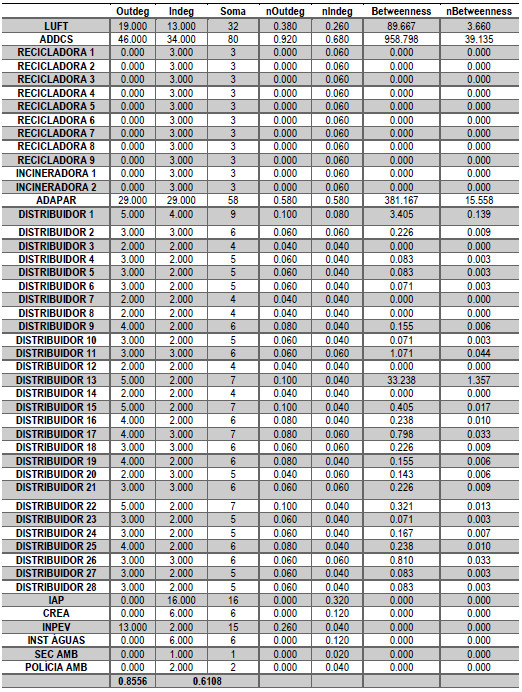 Assim, há um total de 51 nós e 207 relações existentes de 2.550 possíveis, o que demonstra uma densidade de 0,081 ou 8,1% de relações possíveis dentro da rede. Sobretudo no caso em estudo, o total de conexões se faz importante quando se trata da disseminação das informações referentes aos procedimentos que devem ser adotados, bem como o fortalecimento sobre a importância da entrega das embalagens de modo correto no prazo preestabelecido, mesmo que o contato principal dos produtores seja a ADDCS, o máximo de relação e conexões com os diversos atores pertencentes à rede favorece a institucionalização dos processos. Sendo que, de acordo com Sacomano Neto (2004), “quanto maior a interconexão, maior a densidade [...] facilita o fluxo de informações e recursos. Sistema fechado de confiança e normas compartilhadas. Facilita a atribuição de sanções”.