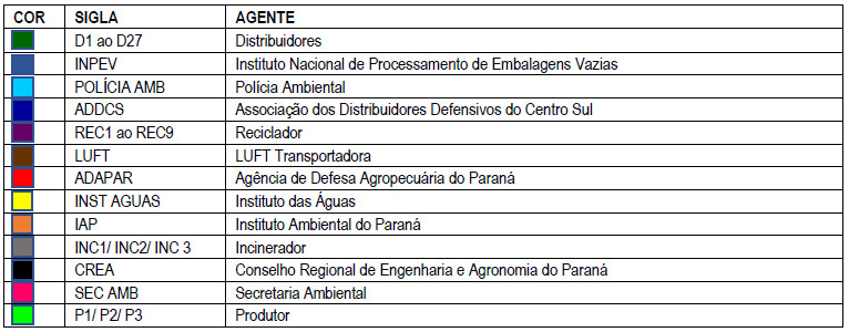 Os demais atores que fazem parte da rede possuem como função a fiscalização e as atividades educativas, no sentido de fazer com que o produtor compreenda a importância desse processo, são eles: Polícia Ambiental, Secretaria do Meio Ambiente, Instituto das Águas, Instituto Ambiental do Paraná e Agência de Defesa Agropecuária do Paraná (ADAPAR). Além de recicladoras, incineradoras, transportadora e produtor, independente do porte e da quantidade consumida, fazem parte da rede, e o INPEV.