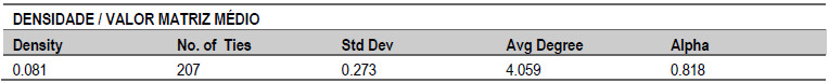 Logo, buscou-se compreender quão densas são as relações entre os agentes, ou seja, o número de relações e conectividade, se alta ou baixa.