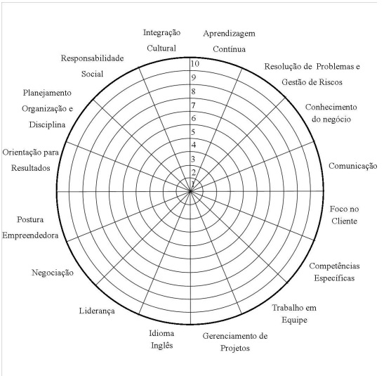 Na segunda parte da atividade, os discentes da graduação foram orientados a se autoavaliarem em cada uma das competências abordadas na ferramenta, as quais eram correspondentes à Tabela 1, tendo como parâmetro de avaliação as competências compreendidas por esses discentes como necessárias a um Gestor de Pessoas. Assim, os discentes da graduação avaliaram seus níveis de desenvolvimento como se fossem Gestores de Pessoas em cada competência apresentada pela ferramenta, sendo necessário indicar, de acordo com uma escala de 1 a 10 (sendo 1 não apresenta a competência e 10 apresenta a competência totalmente desenvolvida), qual o nível percebido de desenvolvimento, pintando a escala dentro da nota atribuída. Após pontuarem todas as competências, foi solicitada uma reflexão sobre os resultados demonstrados, levando ao questionamento quanto ao nível e ao equilíbrio das competências para permitir que essa roda gire. Os estudantes expuseram que, segundo suas concepções, possuíam competências em alto nível de desenvolvimento, mas também possuíam outras em níveis inferiores, identificaram então que estas competências insuficientes explicariam um provável desempenho profissional ruim como gestor de pessoas; alguns estudantes alegaram ainda que diante de uma avaliação desta não se contratariam para o cargo em questão.
