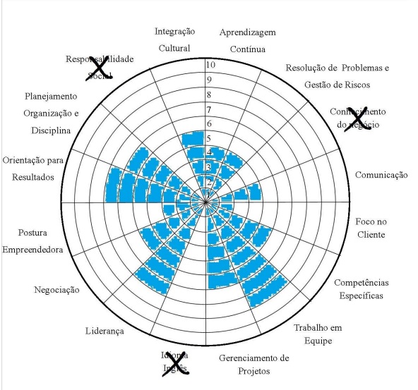 João relatou que a escolha pelo curso de Administração ocorreu pelo interesse específico na área de estratégia organizacional e, no decorrer das disciplinas, assim como dos estágios realizados durante a graduação, compreendeu a função estratégica da área de Gestão de Pessoas e definiu veementemente que seguiria carreira como Gestor de Pessoas para potencializar o desenvolvimento estratégico da organização em que viesse a atuar com tal cargo. Nesse sentido, preencher a Roda de Competências tendo em foco o cargo de Gestor de Pessoas, resultando nos níveis de desenvolvimento de competências apontados na Figura 2, possibilitou a João identificar por si seu atual potencial para assumir as responsabilidades desse Gestor. Ressalta-se, entretanto, que embora a autopercepção possa não ser fiel aos reais níveis de desenvolvimento de competências de um profissional, o fato de a autoavaliação gerar reflexões sobre diversas competências possibilita ao indivíduo, no final da atividade, identificar com mais clareza seus pontos fortes e seus pontos fracos. No caso da Roda de Competências do estudante João, foi possível perceber a assimetria entre as competências, emergindo claramente os pontos fracos – no caso, as competências pouco desenvolvidas – e os pontos fortes – as competências mais desenvolvidas.