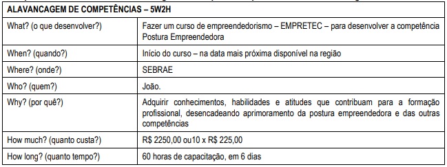 No último momento, os mestrandos especularam sobre as possibilidades para o aprimoramento das competências, enfatizando o desenvolvimento da competência com potencial para alavancar outras, ou seja, desenvolver uma competência baixa – não necessariamente a mais baixa – que tenha potencial para desenvolver outras competências juntamente. Assim que os estudantes identificaram qual competência deveriam focar para desenvolvimento, os mestrandos sugeriram a aplicação da ferramenta de estratégia 5W2H – vide Tabela 2 – para que os graduandos buscassem um desenvolvimento mais profundo para entrarem no mercado de trabalho de forma mais preparada para atuarem na área de gestão de pessoas. A indicação dessa ferramenta para o desenvolvimento de objetivos estratégicos do nível individual ocorreu pelo conhecimento que os alunos da graduação já possuíam acerca da funcionalidade da ferramenta, visto que a mesma havia sido utilizada em um semestre anterior pelos mesmos alunos na disciplina de Consultoria Organizacional – informação adquirida pelos mestrandos durante os debates ocorridos com a graduação. Sendo assim, em posse da identificação de um objetivo individual a ser alcançado – o desenvolvimento de uma competência –, os graduandos apresentaram na ferramenta 5W2H as informações e as ações necessárias para alcançar tal objetivo, identificando responsáveis e custos e agendando datas e locais para o desenvolvimento do objetivo traçado. Desse modo, embora os graduandos não tenham apresentado experiência profissional como gestores, a exposição do cargo por meio de competências permitiu a eles uma percepção mais clara a respeito de suas próprias capacidades para assumir tal posição e projetar sua execução considerando o contexto.