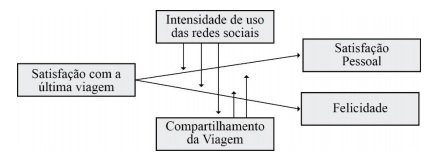 Como consequência desses estudos, nos quais se acredita que a satisfação com a experiência de viagem também contribui para a satisfação pessoal e a felicidade do turista (McCabe & Johnson, 2013; Abou-Zeid & Ben-Akiva, 2012; Sirgy et al., 2011; Nawijn, 2010), bem como o crescente uso das redes sociais e a necessidade de pertencimento colaboram para que o turista publique suas experiências (Sedera et al., 2017; Sheldon & Bryant, 2016; Sigala, 2016; de Oliveira & Huertas, 2015; Correa, Hinsley, & Zúñiga, 2010; Boyd & Ellison, 2007), surge a necessidade de investigar se a relação entre satisfação pessoal e satisfação com a última viagem seria moderada pela intensidade do uso das redes sociais. Verifica-se, dessa maneira, que: