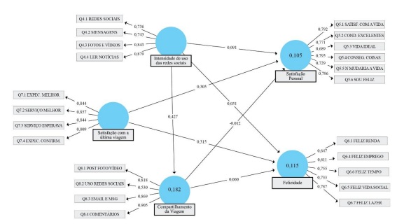 Devido ao fato de ser um instrumento nunca testado anteriormente, desenvolveu-se um modelo para, em seguida, tratar por meio da Modelagem de Equações Estruturais (MEE), conforme apresentado anteriormente na Figura 1. Assumiram-se para a estrutura analisada duas situações: a satisfação com a última viagem exerce influência na satisfação pessoal com a felicidade; e a intensidade de uso das redes sociais e o compartimento da viagem exercem influência uma sobre a outra.