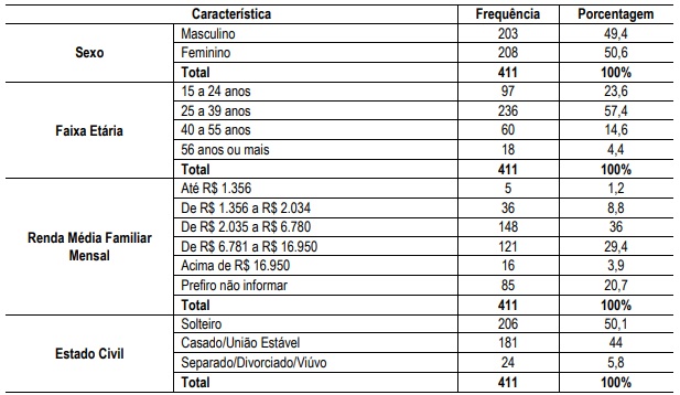 Na Tabela 1, destaca-se que o perfil dos entrevistados, apesar de ser bem homogêneo quanto ao gênero, é composto, em sua maioria, por mulheres (50,6%). É, igualmente, predominante a idade entre 25 e 39 anos (57,4%), pessoas com renda média familiar mensal entre R$ 2.035 e R$ 6.780 (36%) e solteiros (50,1%). Na Tabela 2, percebem-se características sobre o perfil de viagem desses entrevistados: