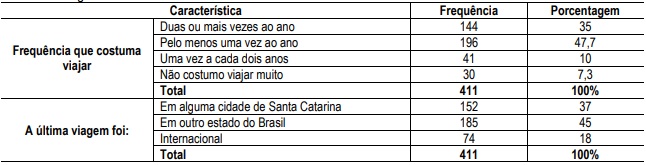 Na Tabela 2, é possível notar que grande parte dos participantes da amostra costuma viajar, pelo menos, uma vez ao ano (47,7%), seguidos pelos que viajam duas ou mais vezes ao ano (35%). As pessoas que não costumam viajar muito (7,3%) são uma minoria. O último destino escolhido, pela maioria dos entrevistados, foi outro estado do Brasil (45%), seguido pelos que viajaram para outras cidades de Santa Catarina (37%) e pelos destinos internacionais (18%).