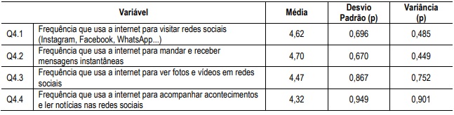 Na Tabela 3, está demonstrada a intensidade do uso das redes sociais e se nota uma média alta - em todas as situações acima de 4,32 - e um desvio padrão baixo. O desvio padrão mede a dispersão da amostra na média. Obteve-se um desvio um pouco maior (0,949), mas ainda assim baixo, quando foi analisado o uso das redes sociais para ler, apenas, as notícias, ou seja, é possível notar que existe uma intensidade alta no uso das redes sociais no dia a dia das pessoas, com as mais variadas finalidades: visitar, enviar mensagens, publicar fotos e vídeos e ler notícias. Esse resultado confirma o que Correa, Hinsley & Zúñiga (2010) constataram em seu estudo, em que os usuários da internet empregam o uso de redes sociais com bastante frequência.