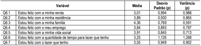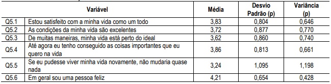 Ao analisar as Tabelas 4 e 5, referentes à satisfação pessoal e à felicidade, nota-se um resultado mediano, com um destaque para a questão “Em geral sou uma pessoa feliz”, que apresentou a média mais elevada (4,21) e um desvio padrão baixo (0,654). Itens como a felicidade com a família (4,36) e com a vida social (3,91) também foram os mais elevados. De uma certa maneira, Seligman (2012) havia comentado a relação entre a satisfação pessoal e a felicidade quando afirmou que quanto mais emoções positivas o indivíduo acumula, mais satisfeito ele se sente de modo geral. Outros autores reforçam, outrossim, que é uma questão pessoal e que varia de acordo com a cultura, a localidade, a classe social, os fatores genéticos e as situações diversas (Lopez, 2017; Diener & Suh, 2003).