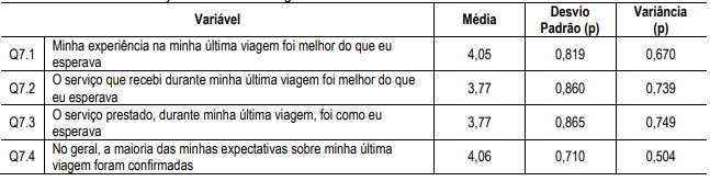 Nesse contexto, a Tabela 6 apresenta os resultados obtidos na pesquisa, no que diz respeito à satisfação com a última viagem. Em geral, as médias da experiência e do cumprimento das expectativas com a última viagem foram altas e variaram entre 4,05 e 4,06, respectivamente, seguidas por um resultado mediano quando se trata dos serviços recebidos na última experiência.