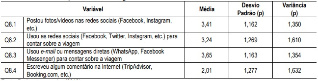 Na Tabela 7, está representado o último construto que mediu o compartilhamento dessa última experiência de viagem nas redes sociais. Com resultados medianos e um desvio padrão alto, observou-se que contar sobre a viagem, postar fotos, vídeos e enviar mensagens não faz parte do comportamento dos respondentes da pesquisa. No que tange aos comentários na internet, em sites como Booking e TripAdvisor, por exemplo, esse resultado foi ainda menor. Nesse sentido, os resultados contradizem os estudos de Jadhav et al. (2018), Sedera et al. (2017), Choe, Kim e Fesenmaier (2017), Sheldon e Bryant (2016), Guerra, Gosling e Carvalho (2015) e de Ma e Chan (2014), que evidenciam que as pessoas buscam afirmação ao utilizar as redes sociais e pretendem ser geradoras de conteúdo. Verifica-se, por conseguinte, que esses resultados seguem a mesma linha de raciocínio de Ek Styvén e Foster (2018), Bilgihan et al. (2016), Nemec Rudež e Vodeb (2015), Munar e Jacobsen (2014) e de Lee e Ma (2012), os quais afirmam que adquirir conhecimentos pelas redes sociais não significa que as pessoas estão dispostas a criar conteúdos e a compartilhar as suas experiências. Salientam, ainda, que essa questão está atrelada a outros aspectos.