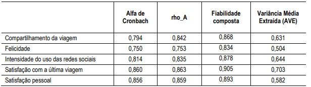 Na Tabela 8, é possível avaliar a consistência interna dos indicadores do construto. Essa análise exige uma confiabilidade, composta com carga acima de 0,70, para ser considerada satisfatória e um Alfa de Cronbach também acima de 0,70, que é o valor mínimo recomendado (Hair et al., 2009). Dentro dessa perspectiva, é possível concluir que os dados estão satisfatórios, pois se encontram acima dos níveis apontados como ideais.