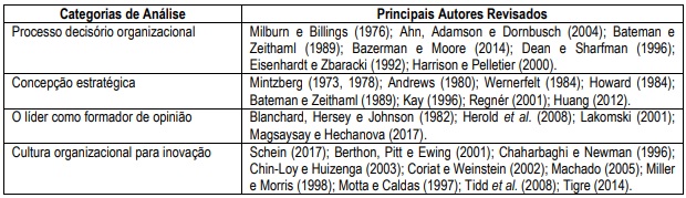 Os dados foram coletados por meio de entrevistas não estruturadas realizadas na organização pesquisada com onze líderes. Foram entrevistados: o presidente da empresa, que é o filho do fundador da organização; um diretor industrial; um gerente e oito coordenadores de linhas de produtos, estes lotados na área de P&D. O foco das entrevistas concentra-se na área de P&D, pois o diretor presidente encontrou maior resistência das pessoas dessa área para implementação da nova estratégia organizacional de inovação. Além das entrevistas foram realizadas observações assistemáticas durante as visitas realizadas na empresa. As observações foram anotadas em um diário de campo. Na Figura 1 estão evidenciadas as categorias de análise com o respectivo suporte teórico.