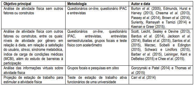 Jackson et al. (2014), Schwarz e Lindorfs (2015), Barber et al. (2015) pesquisaram a atividade física e a relação desta com outros construtos ou fatores. Esses estudos permitem ter uma visão integrada da atividade física e impactos nas organizações, principalmente no que se refere à produtividade, ao desempenho, à capacidade e à disposição para o trabalho. Os resultados positivos foram percebidos por Schwarz e Lindorfs (2015), em pesquisa com mulheres cuidadoras de idosos, sendo que a atividade física aumentou a capacidade física para o trabalho, embora mais pesquisas sejam necessárias sobre os resultados relacionados com a produtividade. Barber et al. (2015) destacaram que os resultados de um programa de gerenciamento de peso no local de trabalho, durante 12 semanas, foram uma opção que, além de conseguir a perda de peso e melhorar os resultados de saúde dos funcionários, levou a melhorias no bem-estar geral, na qualidade de vida e no desempenho no trabalho.