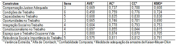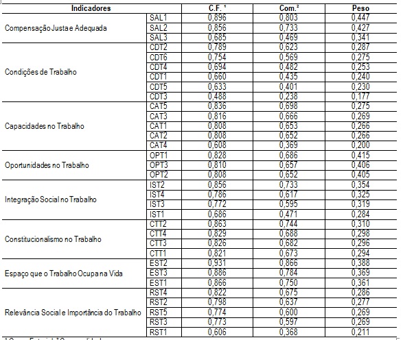Foi realizada a análise fatorial dos dados da escala de qualidade de vida no trabalho. Pode-se observar que apenas o item CDT3 do construto Condições de Trabalho apresentou uma carga fatorial abaixo de 0,50. De acordo com Hair et al.(2009), itens com cargas fatoriais menores que 0,50 devem ser eliminados dos construtos, pois, ao não contribuir de forma relevante para formação da variável latente, prejudica o alcance das suposições básicas para validade e qualidade dos indicadores criados para representar o conceito de interesse. Porém se optou por não excluí-lo, uma vez que todas as suposições básicas para validade e qualidade dos indicadores (dimensionalidade, confiabilidade e validade) foram atendidas, conforme será apresentado a seguir (Tabela 1).