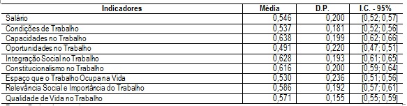 Como resultado da análise fatorial, foram criados oito indicadores, como demonstra a Tabela 3. Nela são descritos os indicadores, com suas respectivas médias, desvio padrão e intervalo de confiança (IC). Os indicadores foram fixados para variar de 0 a 1, sendo que o indicador Qualidade de Vida no Trabalho foi criado a partir da média dos indicadores.