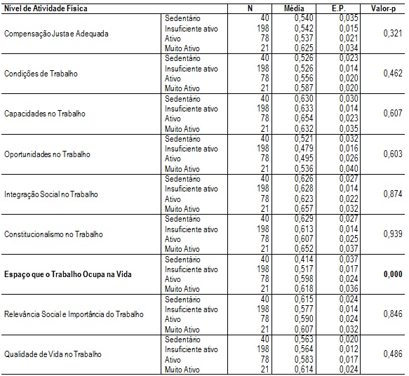 A partir da análise da Tabela 4, pode-se perceber que houve diferença significativa (Valor-p=0,000) somente da dimensão “Espaço que o Trabalho Ocupa na Vida” entre os níveis de atividade física, sendo que os indivíduos sedentários apresentaram menor satisfação com a dimensão “Espaço que o Trabalho ocupa na Vida”. Um dos problemas ocasionados pelas pressões do trabalho contemporâneo é a falta de tempo, que, normalmente, está ligada à jornada excessiva de trabalho, ao tempo para as obrigações familiares, à dificuldade na administração do tempo e à ausência de tempo para atividade física (Edmunds et al., 2013). Um impacto preocupante, haja vista que os estudos indicam que o equilíbrio entre vida e trabalho deve ser mantido (Scoth Leicht et al., 2103; Brown et al., 2014) para evitar o adoecimento do trabalhador, o que, no presente estudo, mostra-se pendente apenas para o lado do trabalho. Nos estudos de Walton (1973), a qualidade de vida no trabalho depende da conciliação do tempo de trabalho com o tempo de lazer e família.