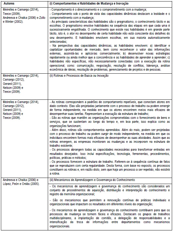 A seguir, a Figura 1 apresenta as definições dos elementos componentes e mecanismos organizacionais de desenvolvimento de capacidades dinâmicas, ou seja, comportamentos e habilidades de mudança e inovação, rotinas e processos, busca ou inovação e mecanismos de aprendizagem e governança do conhecimento.