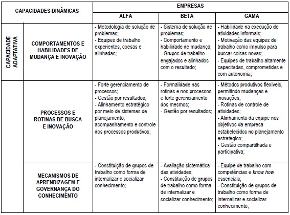 As empresas Alfa, Beta e Gama no desenvolvimento de capacidade adaptativa são dotadas de equipes de trabalho alinhadas, comprometidas e que internalizam e socializam conhecimento. As empresas Alfa e Beta são similares no sistema de solução de problemas, gerenciamento dos processos e gestão por resultados. A Gama, por sua vez, distingue-se pela habilidade na execução de atividades informais, motivação das equipes de trabalho, flexibilidade dos métodos produtivos e pela gestão compartilhada e participativa.