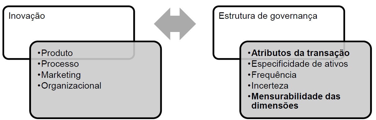 Com base nessas discussões, a próxima seção apresenta o quadro teórico para o entendimento das estruturas de governança a partir da ECT e ECM. Entende-se que inovações podem ampliar o entendimento acerca de ativos específicos e a construção de sistemas diferenciados, permitindo a compreensão sobre a forma como as estruturas de governança distribuem os direitos de propriedade, considerando os investimentos e os esforços para inovar.