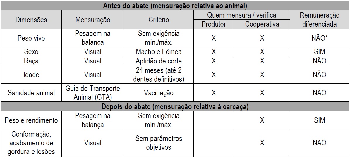 - Idade: a idade máxima do animal para abate, por se tratar de novilho precoce, é de 24 meses. Essa verificação é realizada visualmente, em todos os animais, pela cooperativa e pelos produtores, antes do abate, a partir da verificação dos dentes dos animais. Segundo os entrevistados, a presença de dois dentes definitivos equivale à idade de 24 meses, enquanto dentes de leite correspondem a uma idade inferior. Essa informação é disponibilizada, no final de cada abate, no romaneio de abate. Os produtores devem atender a esse requisito, porém animais mais jovens não recebem remuneração melhor;